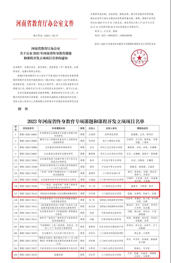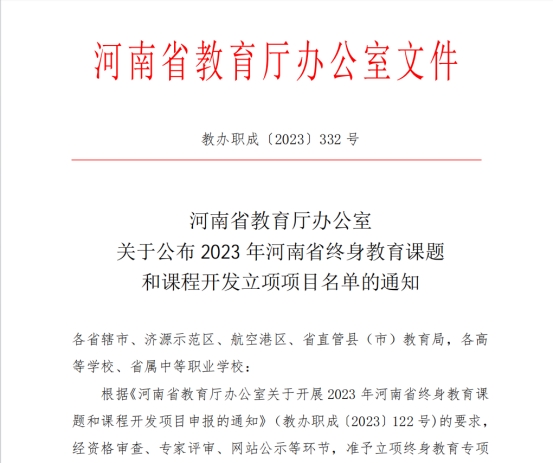 近日,河南省教育厅公布了2023年河南省终身教育课题和课程开发立项项目名单(教办职成〔2023〕332号),公司申报的项目获批课题2项,课程1项。