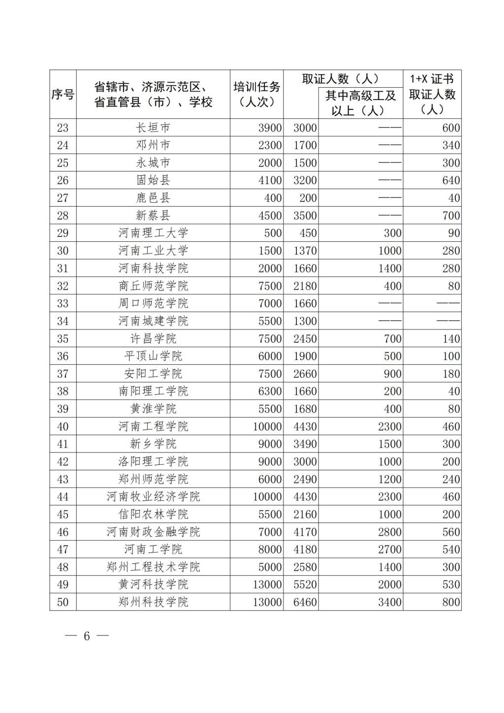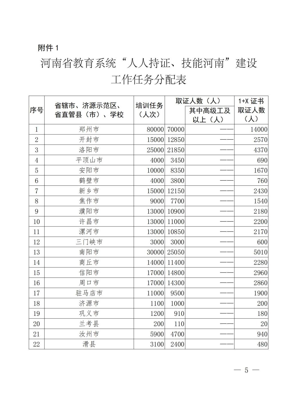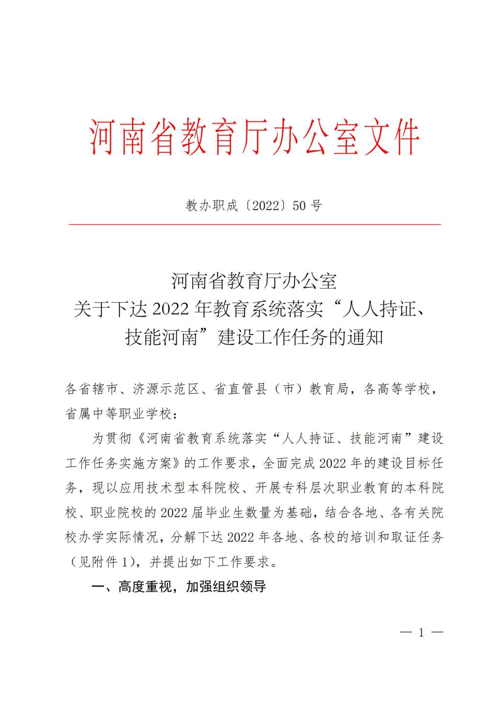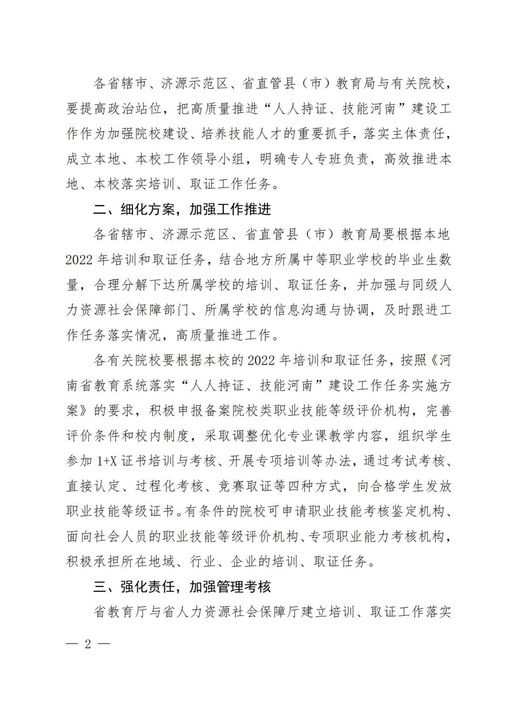 教办职成〔2022〕50号-河南省教育厅办公室 关于下达2022年教育系统落实“人人持证、技能河南”建设工作任务的通知