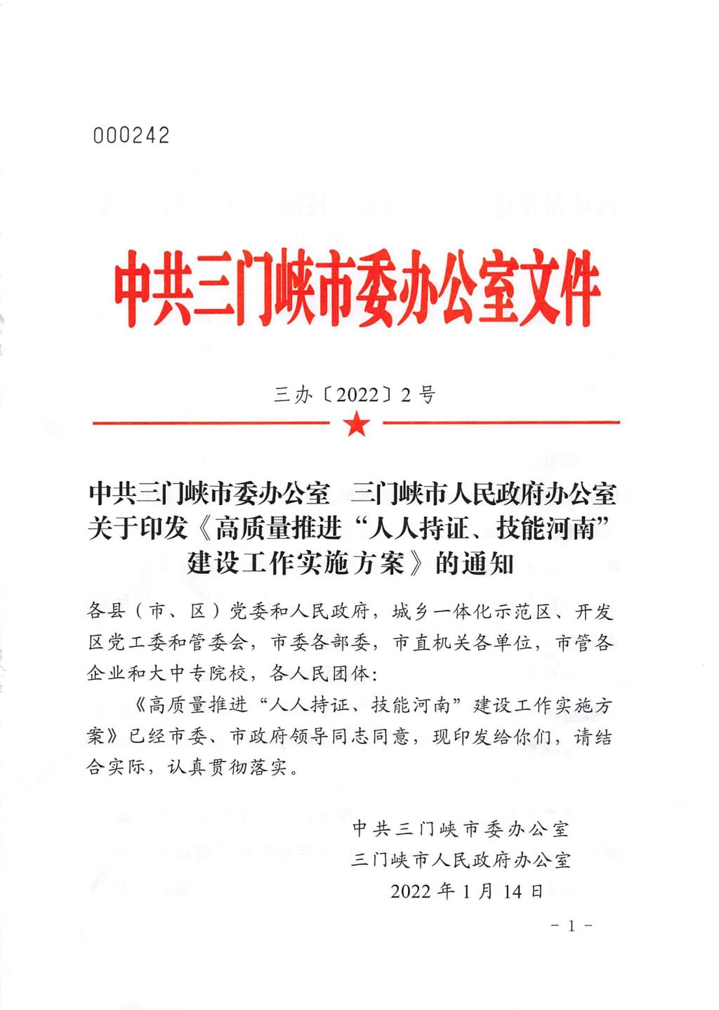 三门峡市委市政府关于印发“人人持证、技能河南”实施方案的通知